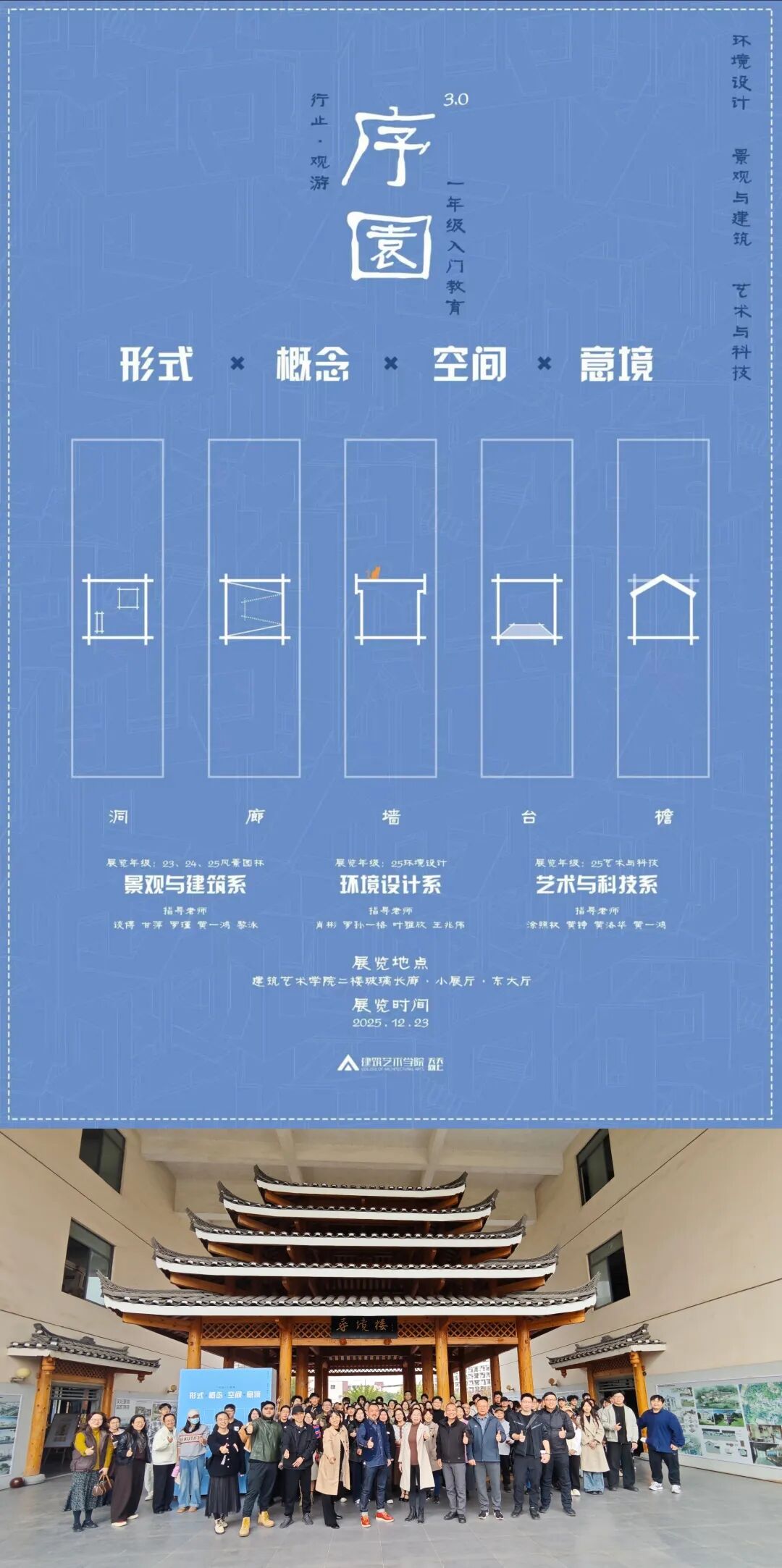 2025年12月30日上午,建筑艺术学院2025级风景园林、环境设计、艺术与科技专业《形式·概念·空间·意境》课程作业展在建院二楼举办,学院书记向丽丽、院长莫敷建、副书记韦俊宇、副院长莫媛媛,环境设计系主任边继琛、艺术与科技系主任贾悍、景观与建筑系主任潘振皓、各位任课教师以及2025级全体同学参加了作业展开幕式。
